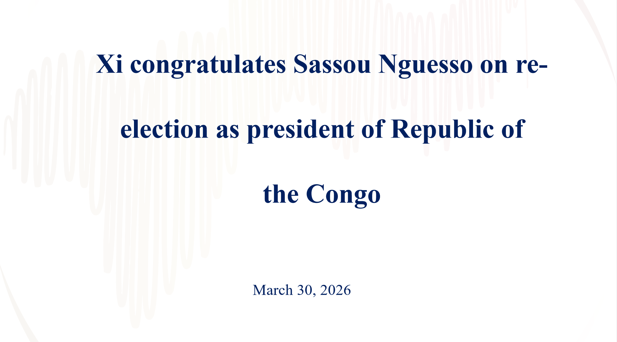 BEIJING, March 30 (Xinhua) -- Chinese President Xi Jinping on Monday sent a congratulatory message to Denis Sassou Nguesso on his re-election as president of the Republic of the...