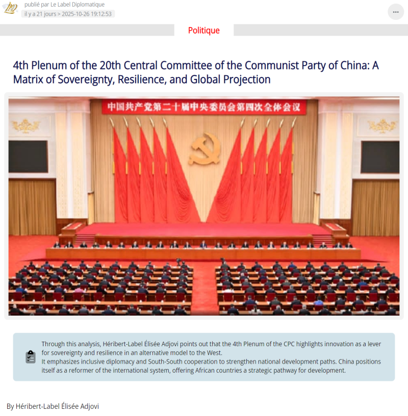 China’s proactive diplomacy aims to reshape global governance around principles of sovereignty, equity, and cooperation. It offers countries of the Global South—and African nations in particular—an alternative to dominant paradigms, grounded in mutual respect, complementarity, and co-construction. The 4th Plenum confirms this commitment by linking diplomacy, development, and security within a systemic vision.